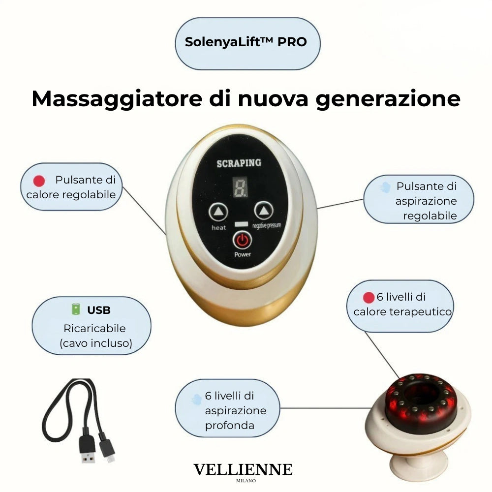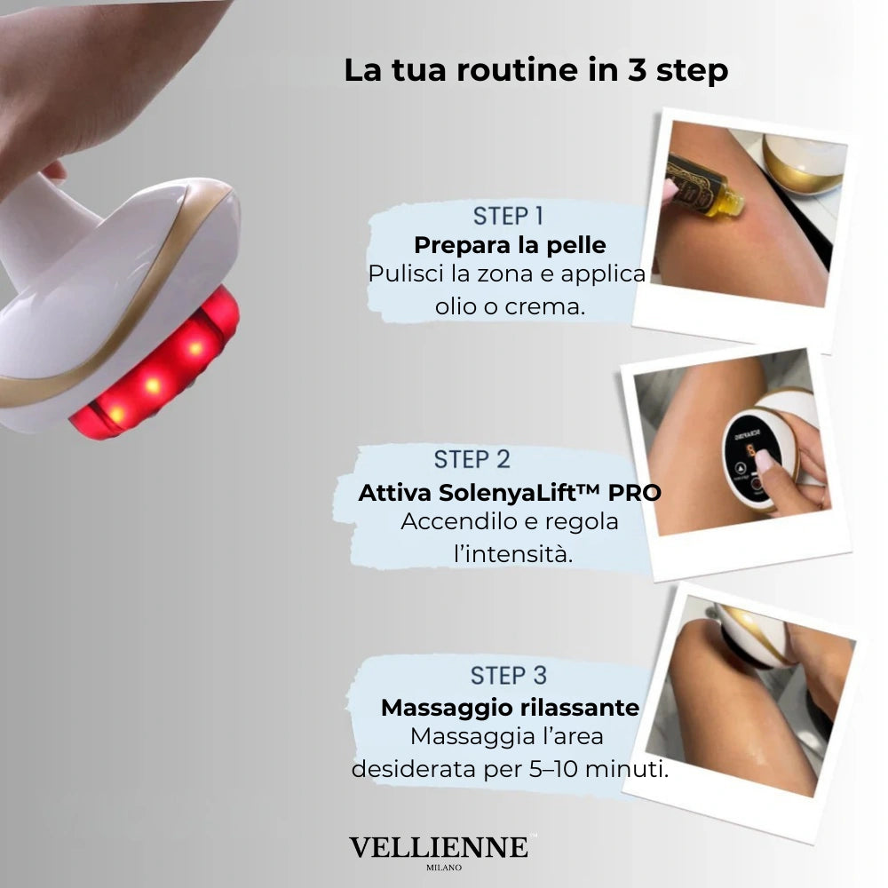 Il nostro obiettivo è offrire soluzioni efficaci e accessibili a chi desidera sentirsi al meglio nella propria pelle. Per questo abbiamo scelto di proporre SolenyaLift™ PRO, un dispositivo pensato per chi vuole migliorare l’aspetto e il tono della pelle in modo semplice, comodo e sicuro — direttamente da casa. Grazie all’azione combinata di suzione, calore e terapia a luce rossa, SolenyaLift™ PRO favorisce la circolazione, aiuta a ridurre visibilmente cellulite e inestetismi, e contribuisce a donare una pelle più compatta, levigata e vitale.